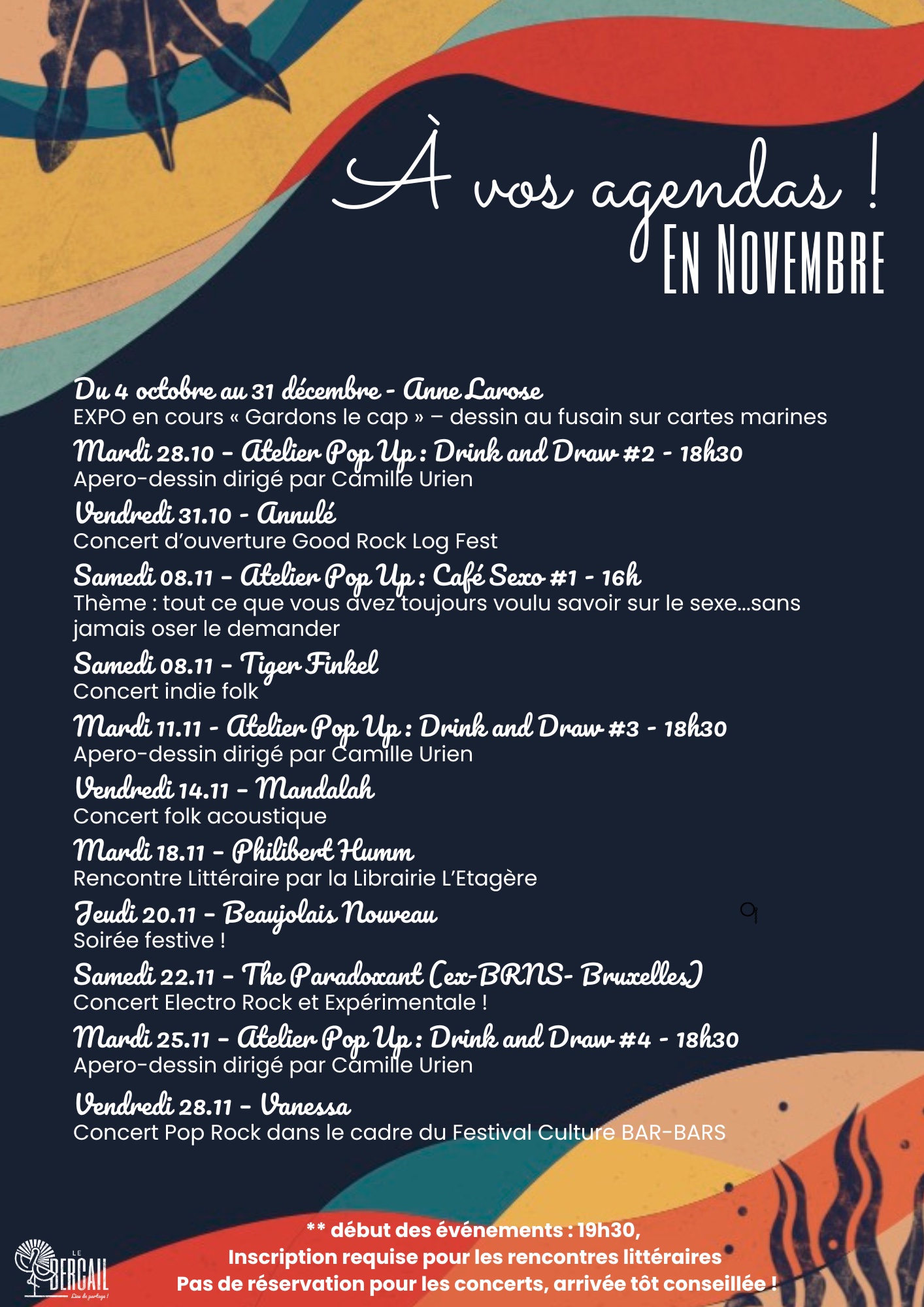 Le Bercail accueille sur ses murs tout au long de l’année des expositions, tous les vendredis des concerts d’artistes ET des rencontres à partir de 19h30. Mais surveillez la programmation dans la semaine aussi il se passe des choses (cours d’œnologie, ateliers créatifs, cercle de parole, etc…) !